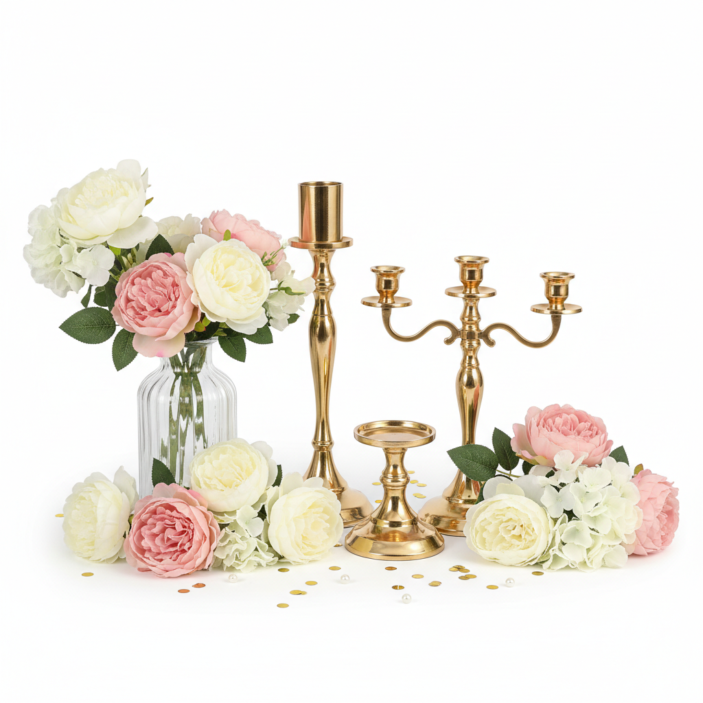 Create stunning table displays with our Elegant Centerpiece Decoration Kit. This complete set features gold candle holders, beautiful artificial flowers, and a coordinating vase, perfect for adding sophistication to wedding receptions, dinner parties, and special events.